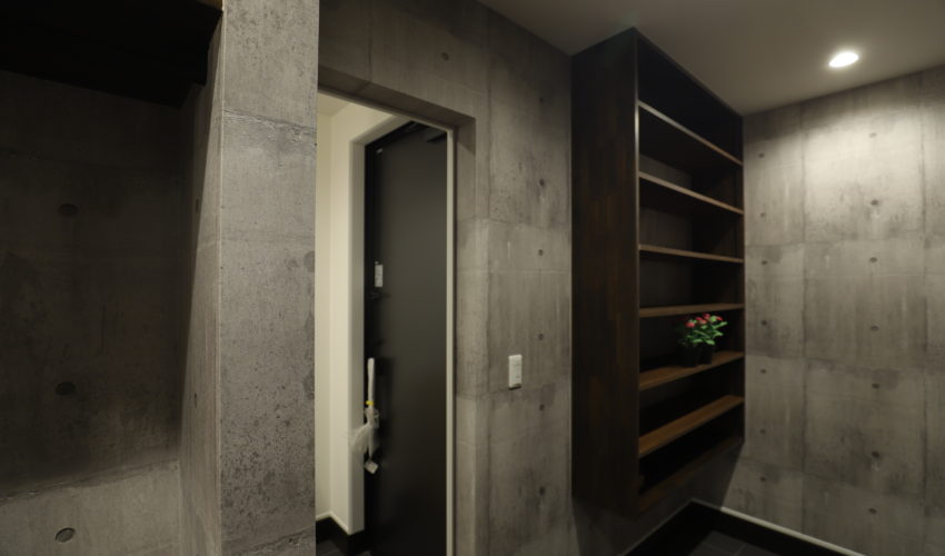 玄関に入ってすぐ横の部分にホールを設けて靴置き場を設置し、玄関とホールの間に縦格子の扉を設けると2つの独立したスペースが出来上がります。