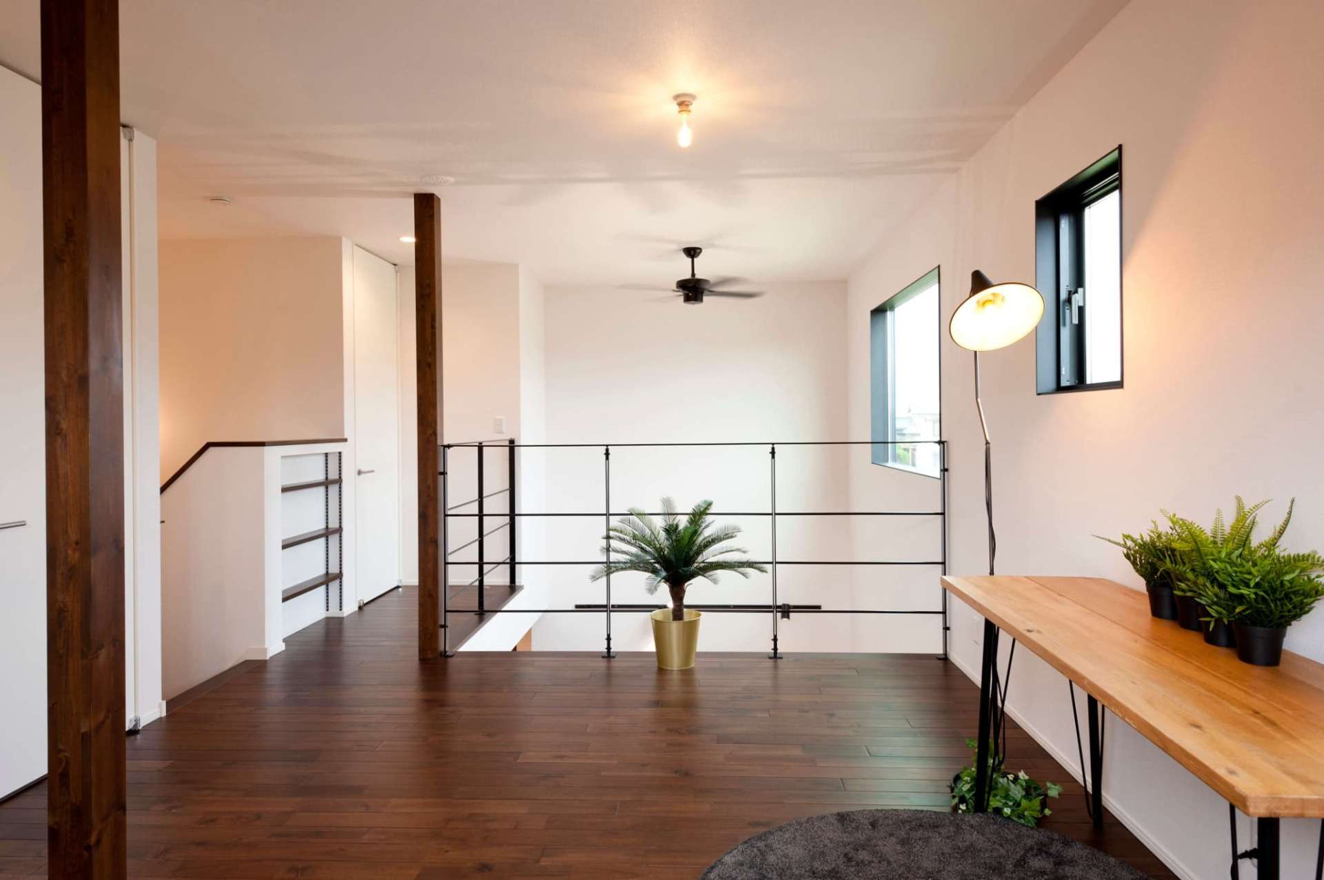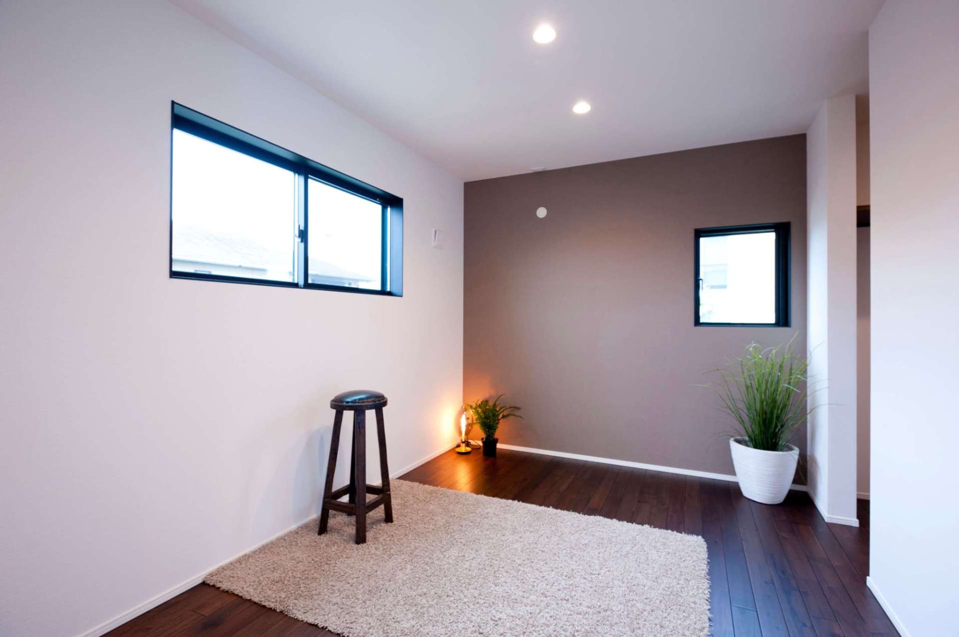 高い位置に配置された窓からは、季節や時間を問わず安定した陽光が降り注ぎます。光が白い壁に反射し、室内を優しく包み込む様子は、住む人の心まで明るくしてくれるような特別な演出。家族や友人と集まるひとときも、自分だけのリラックスタイムも、この開放的な空間が最高のエッセンスとなります。