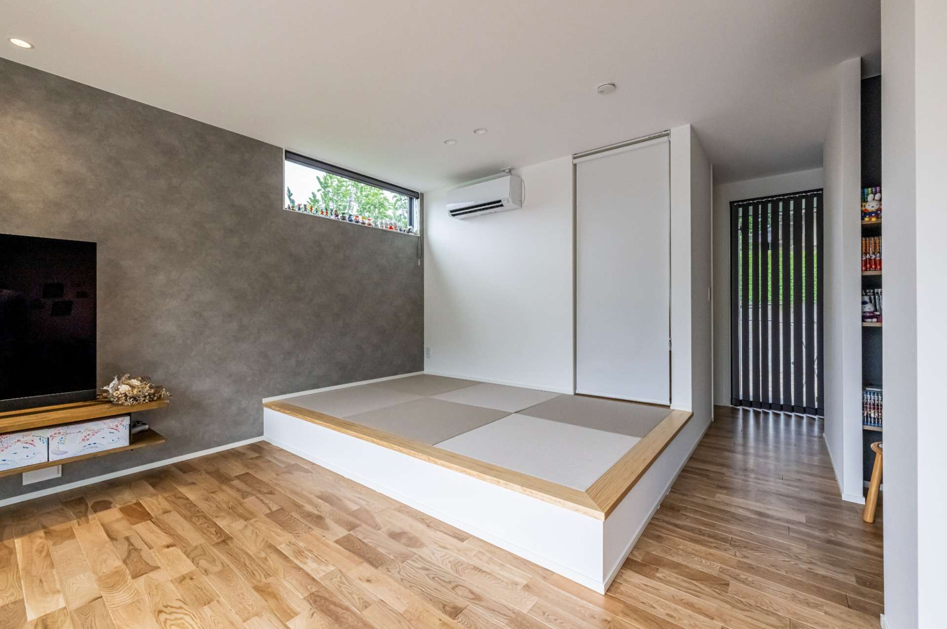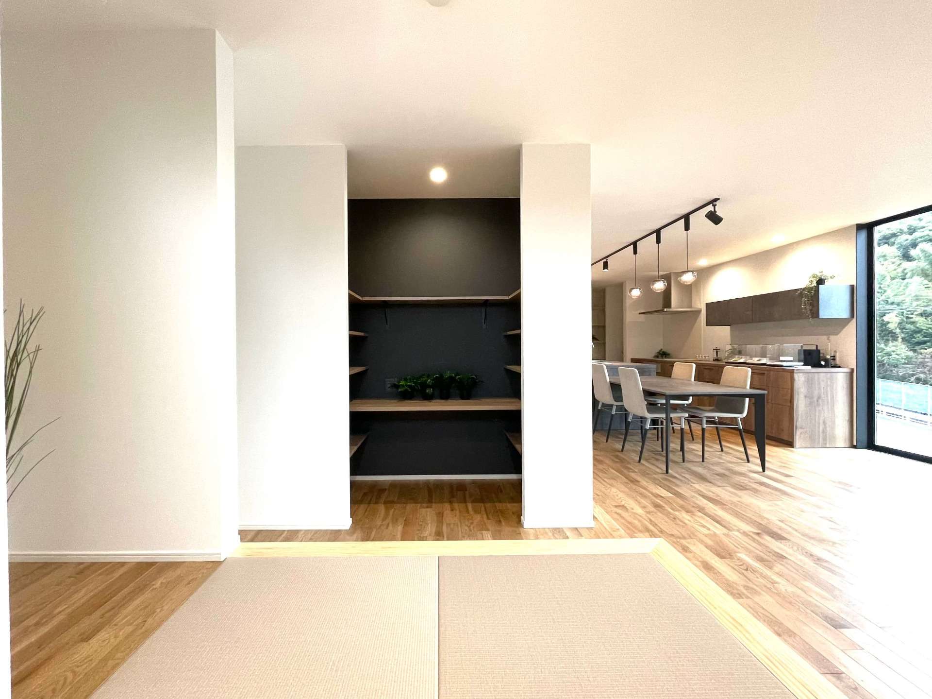 福津市M様邸の中心は、大きな窓から美しい景色を望むことができる開放的なリビングです。このリビングを中心に、キッチン、ダイニング、そして和室が緩やかに繋がるよう設計されています。