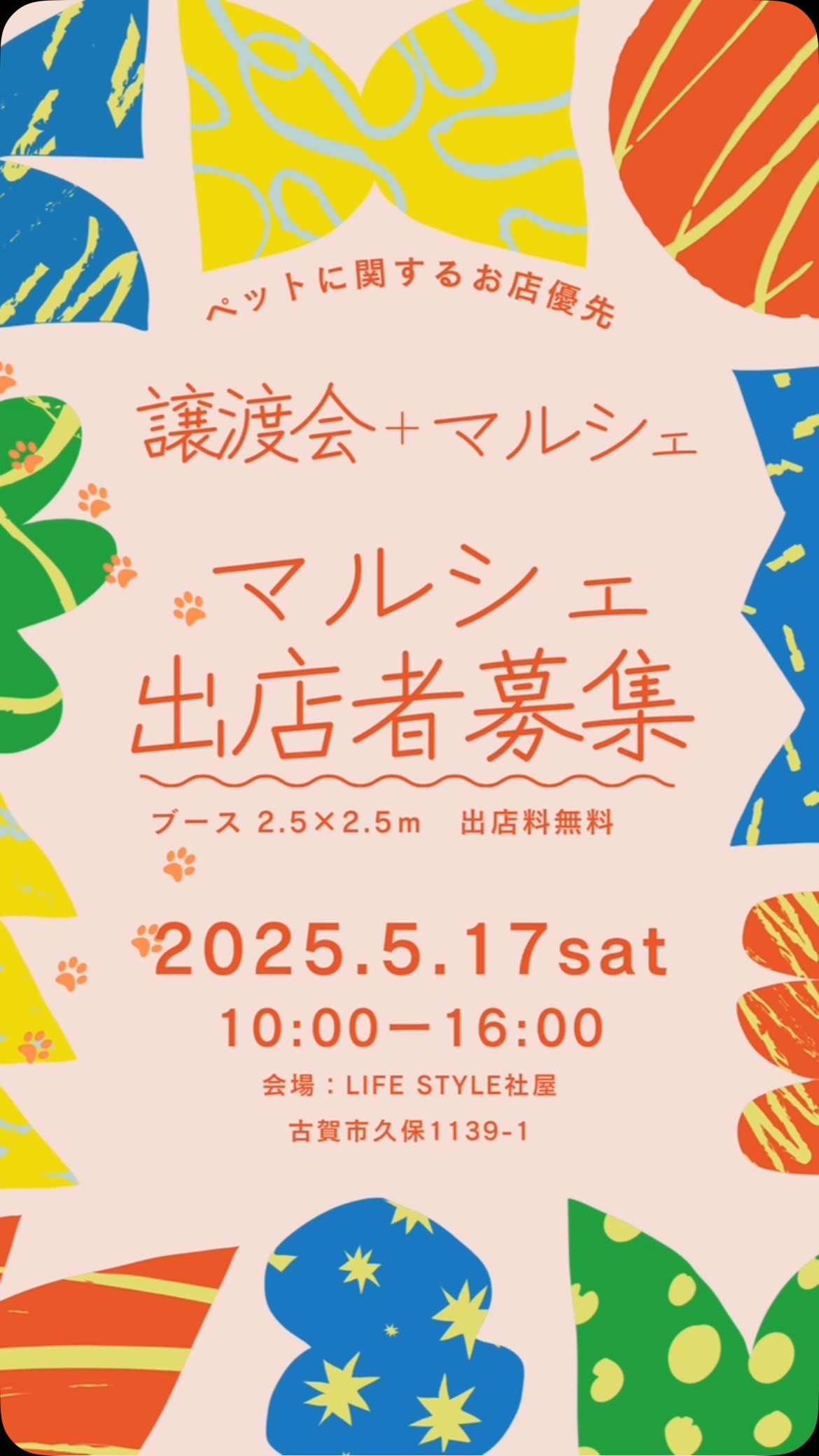 マルシェ出店者募集🐾 マルシェ出店者募集🐾こんにちは、ライフスタイル福岡です。5/17(土)にライフスタイル社屋にてわんちゃんの譲渡会を開催いたします!譲渡会+マルシェイベントを同時開催しますのでマルシェ出店者さまを…
